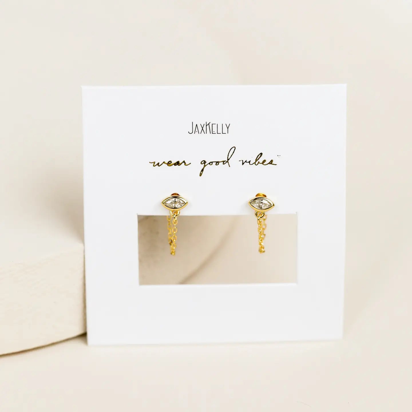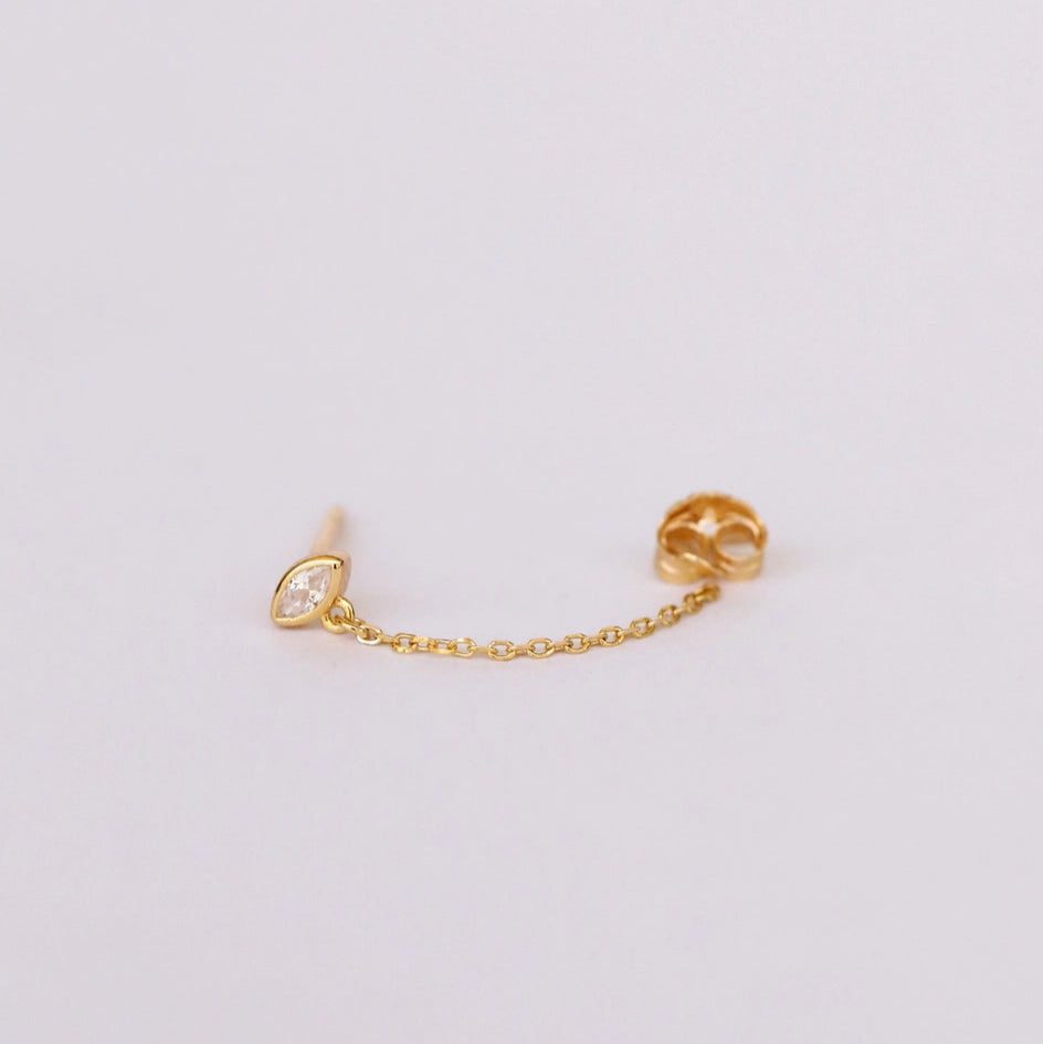 These chain huggies feature a tapered white cz set in a bezel connected to the butterfly backing by a delicate chain.