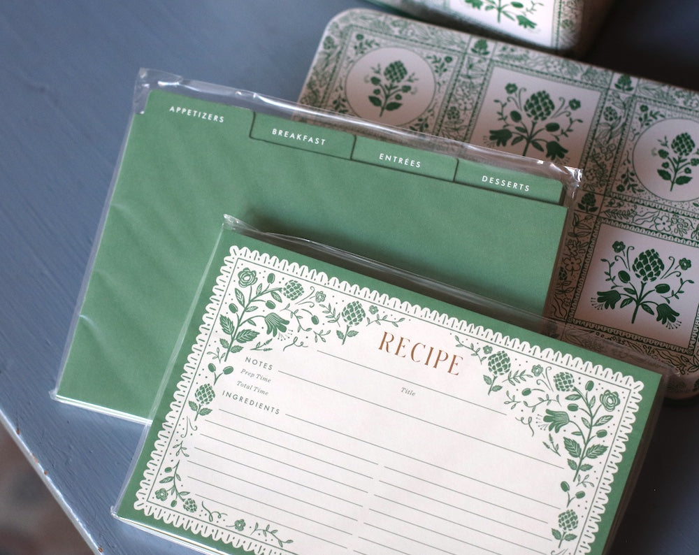 Never lose a family recipe. Holding up to 200 recipe cards, our recipe tins feature printed illustrations, a gold metallic interior, and a gold-framed label, as well as 24 recipe cards and 12 recipe dividers.