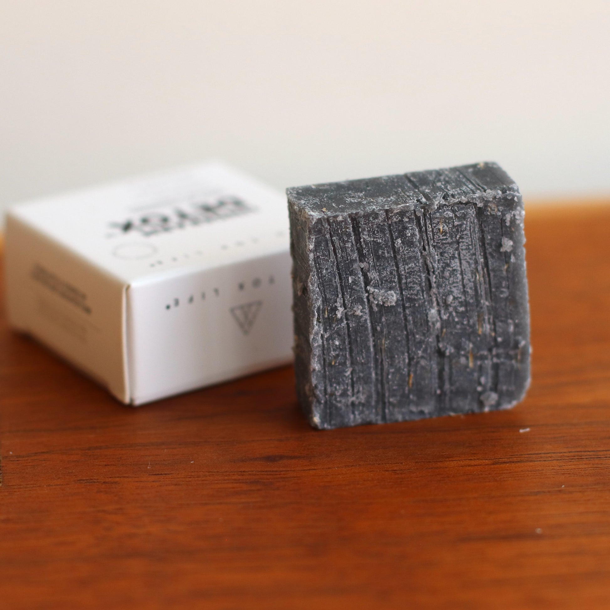 Ingredients: Sodium shea butterate, sodium cocoate, sodium castorate, loofah, clay, activated charcoal Packaging: Paper box that can be easily recycled. fragrance-free | palm-free | detergent-free | gently exfoliates | vegan