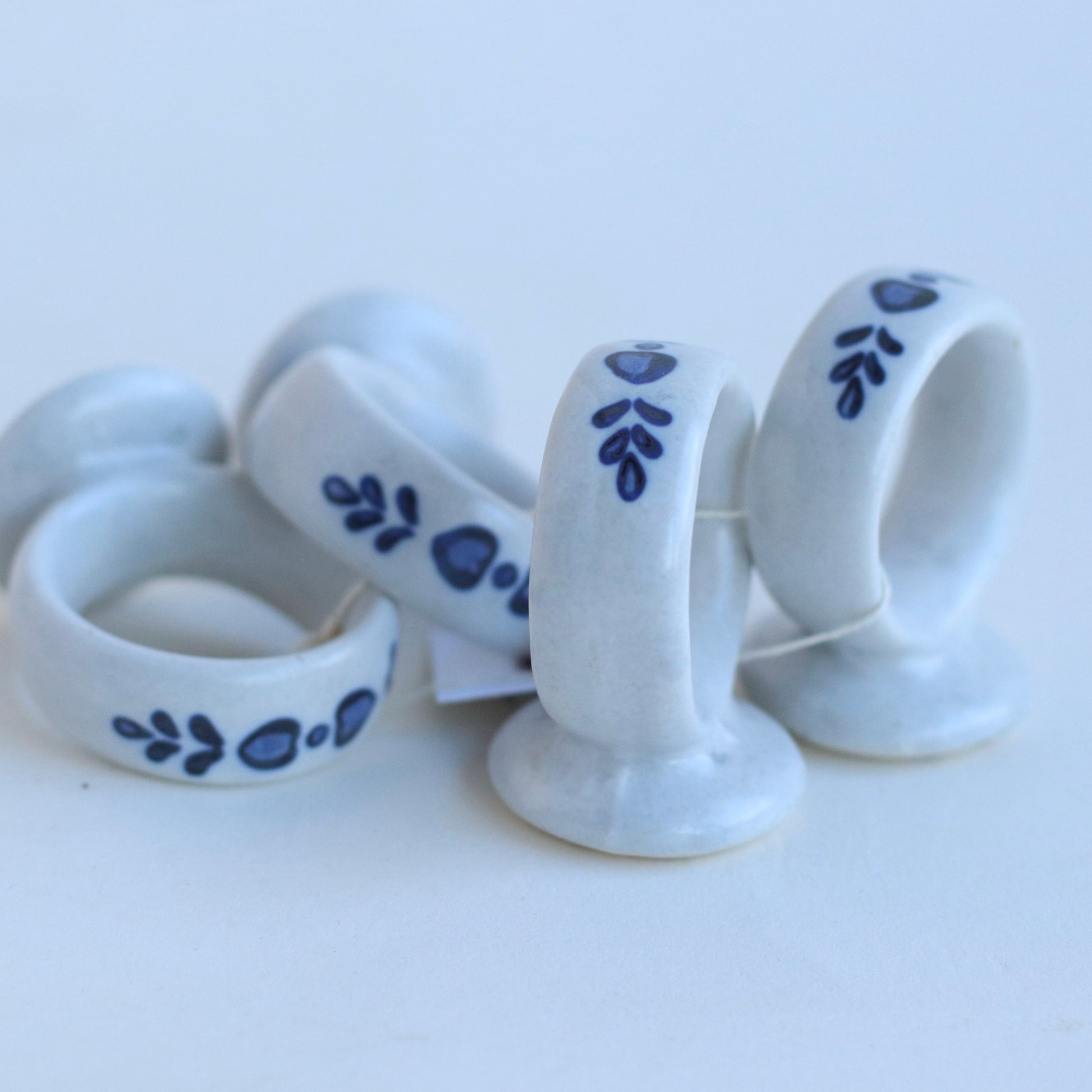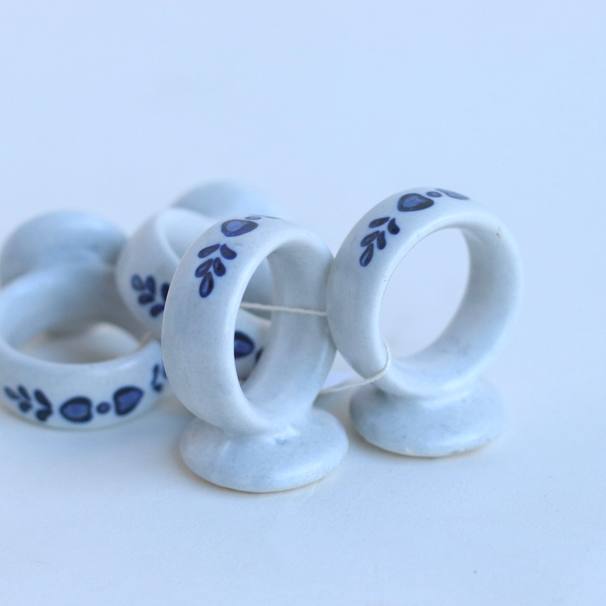 White Ceramic Napkin Rings with Blue Country Motif, set of 4